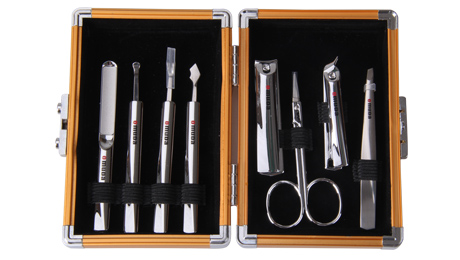 產(chǎn)品規(guī)格:136mm*100mm 產(chǎn)品重量:295g 天地盒規(guī)格:145mm*108mm*35mm 材質(zhì):鋁材+420不銹鋼+碳鋼+鋅合金 配件:平口指甲鉗、美容剪、斜口指甲鉗、眉夾、指甲銼、刮刀、死皮刀、耳挖 套裝顏色:金色